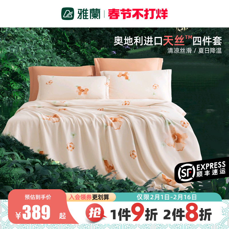 雅兰家纺天丝™四件套冰丝凉感花卉床单床笠裸睡被单双面床上用品