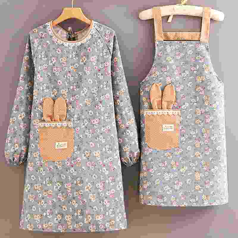 韩版长袖帆布围裙女家用厨房做饭罩衣防污透气餐饮制服大人围腰