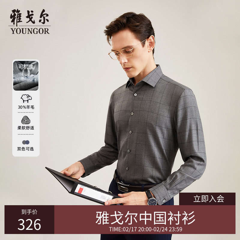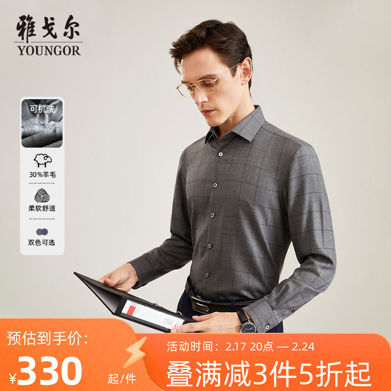 【含30%羊毛可机洗】雅戈尔新款商务保暖舒适易打理格纹长袖衬衫