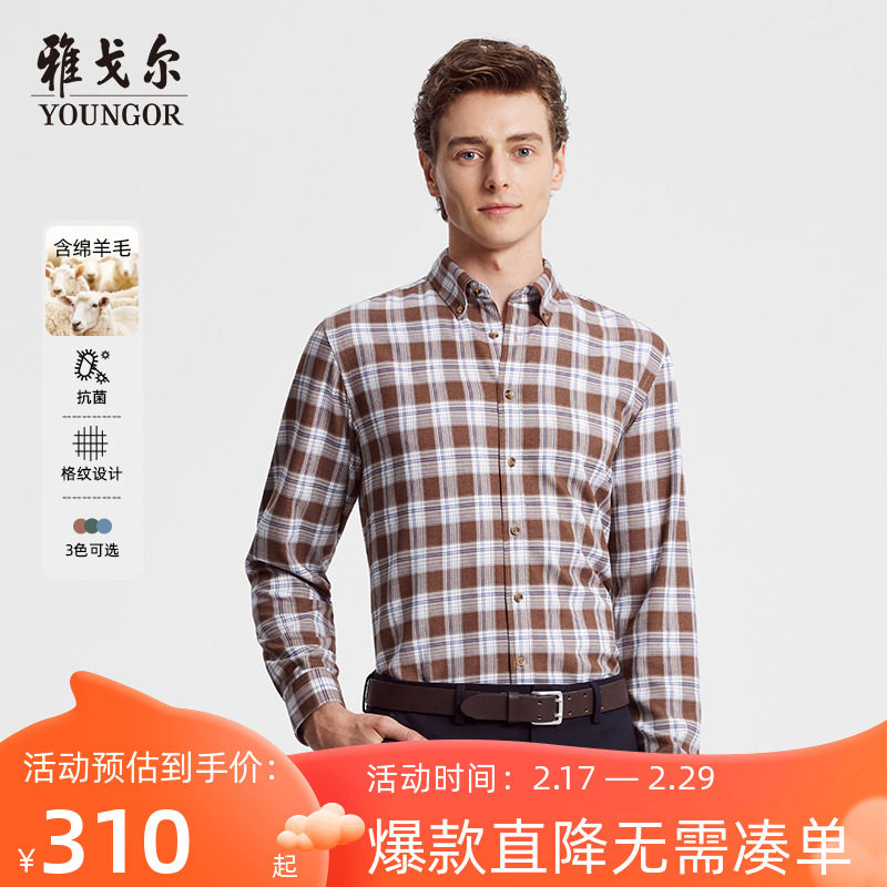 【含40%羊毛可机洗】雅戈尔新款商务休闲格纹保暖长袖衬衫男4916
