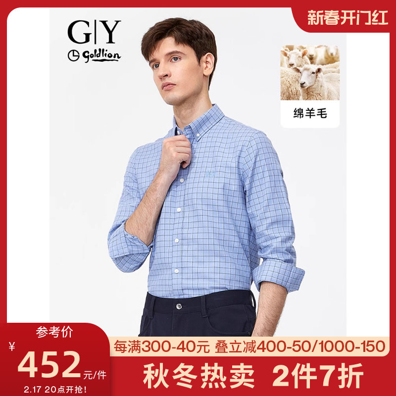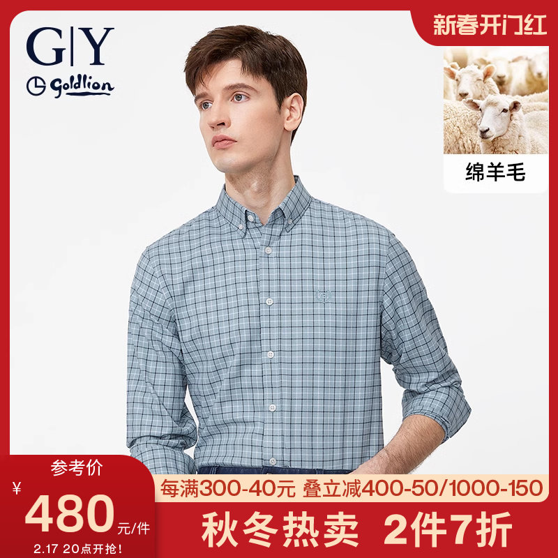【含羊毛】金利来GY格子衬衫男长袖秋季新款长绒棉休闲保暖衬衣帅