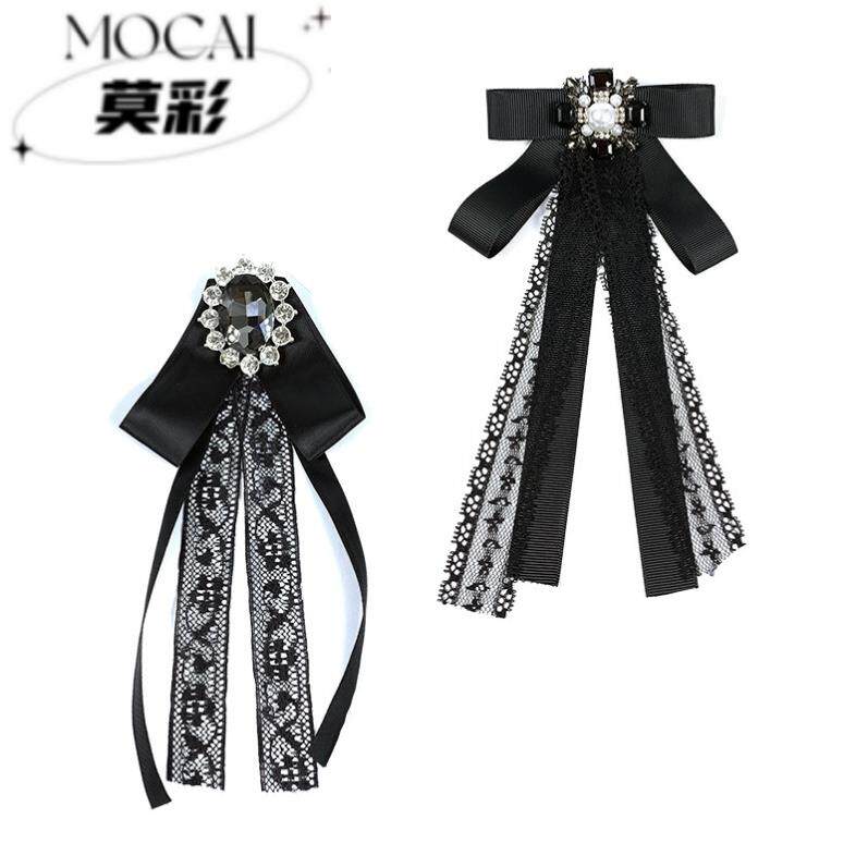 复古钻结布艺胸花别针黑色蕾丝飘带领结胸针衬衫女配饰品领