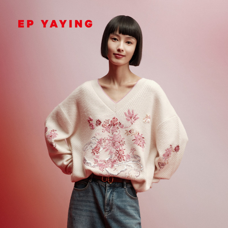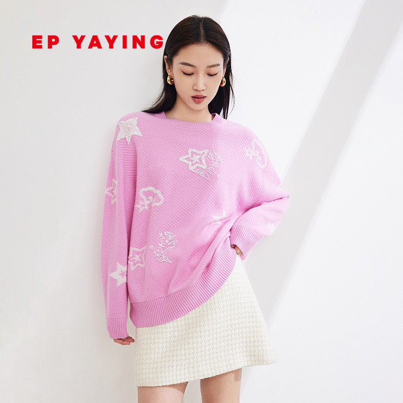 EP YAYING雅莹女装 圆领宽松刺绣针织套头衫 2024早春新款9583A
