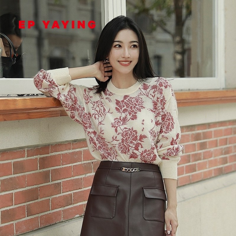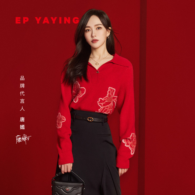 [唐嫣同款]EP雅莹女装 国风提花针织衫上衣红毛衣 秋冬新款9515A