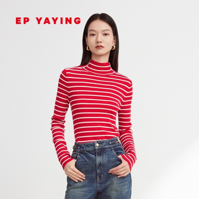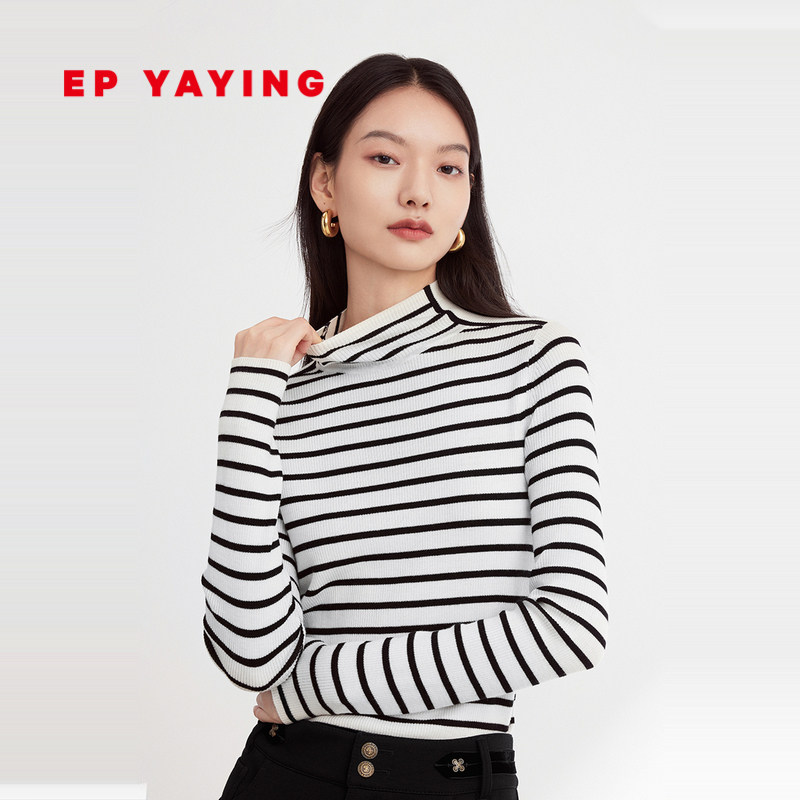 EP雅莹女装 100%美利奴羊毛条纹半高领针织打底衫 2023秋冬9916A