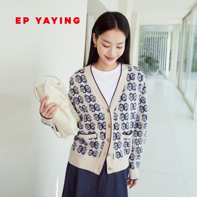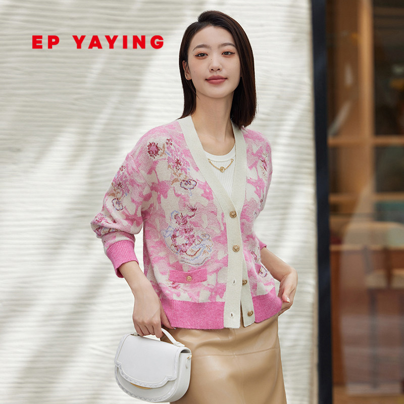 EP YAYING雅莹女装 提花V领廓形针织开衫外套 2023秋冬新款9157A