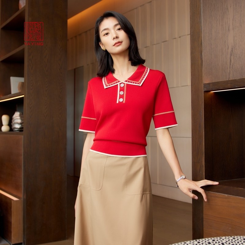 EP雅莹高端系列 polo领撞色珍珠短袖针织衫 2024早春新款9513A