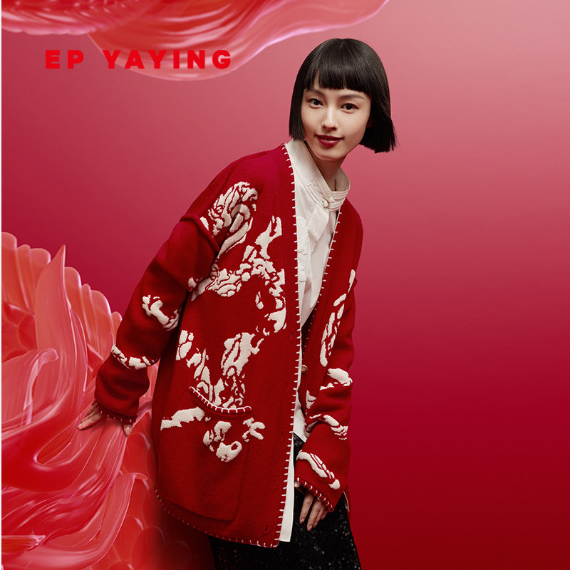 EP雅莹女装 国风提花羊毛新年红色毛衣针织开衫外套 秋冬新9159A