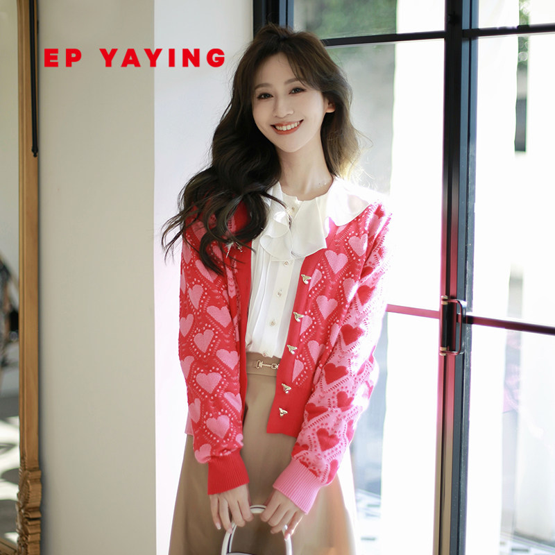 EP YAYING雅莹女装 爱心拼色肌理V领针织开衫 2024早春新品9105A