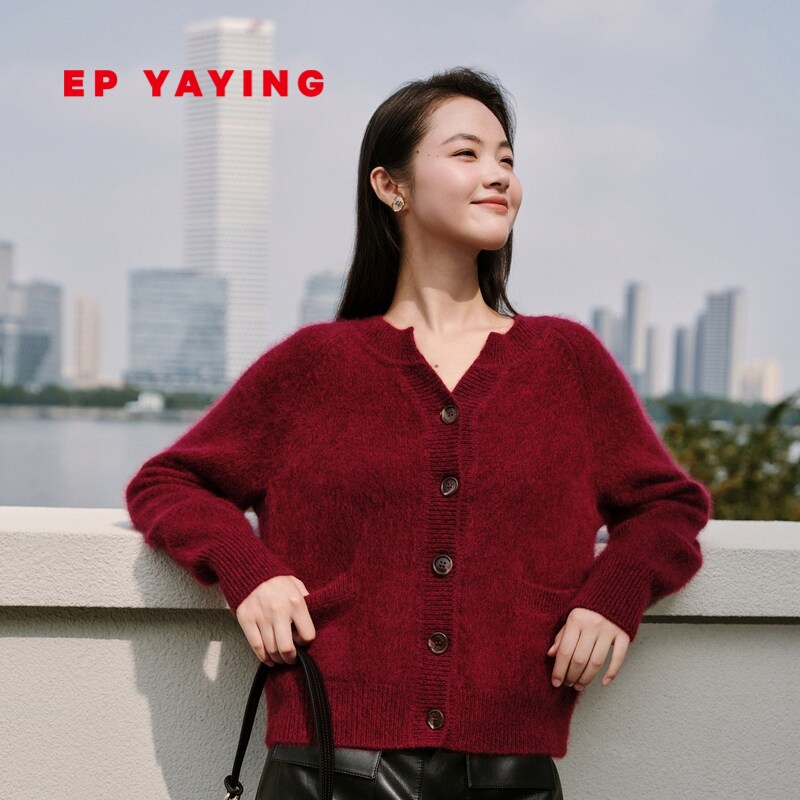 EP雅莹女装 绵羊毛红色小香风针织开衫外套红毛衣 秋冬新9107A