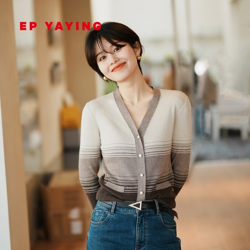 EP YAYING雅莹女装 马海毛V领撞色条纹针织衫 2023秋冬新款9550A
