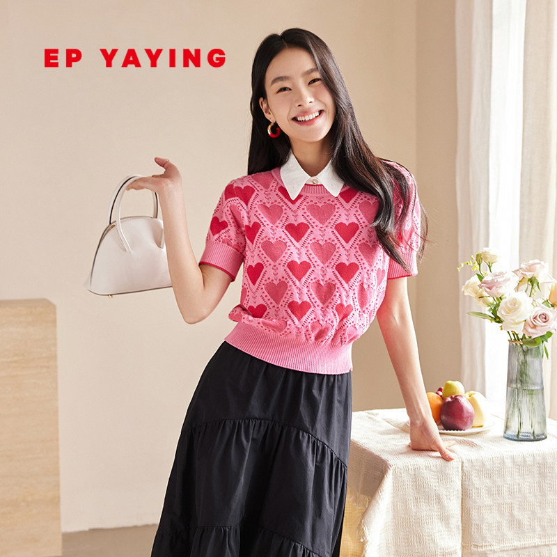 EP YAYING雅莹女装 爱心拼色肌理短袖针织衫 2024早春新品9543A