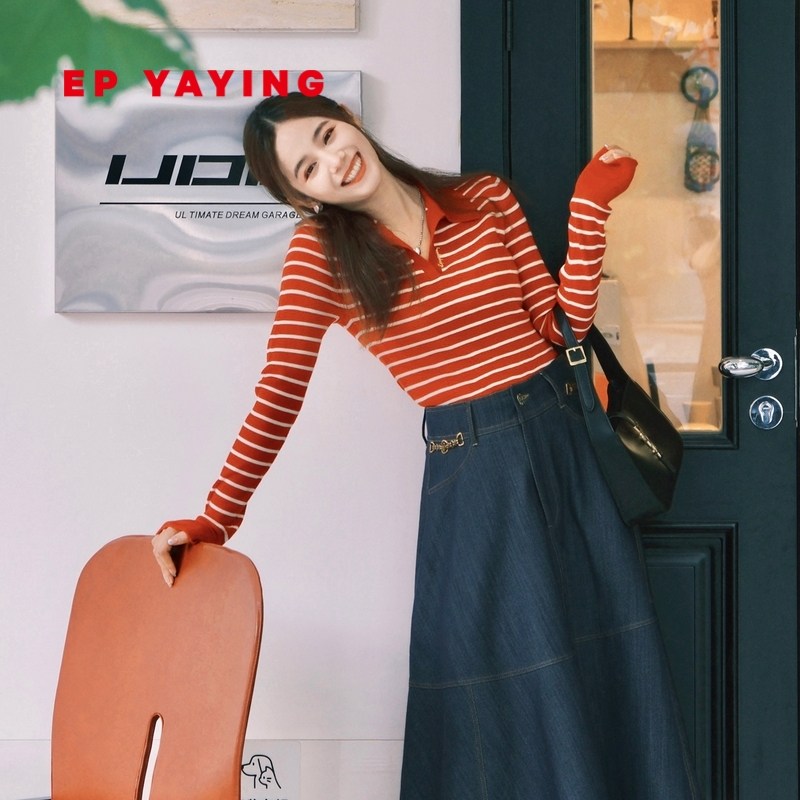 EP雅莹女装 羊毛羊绒polo领条纹针织衫红毛衣 2023秋冬新款9562A