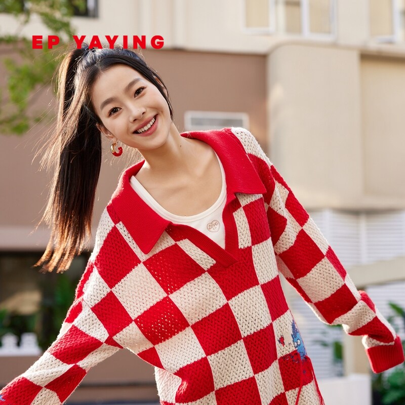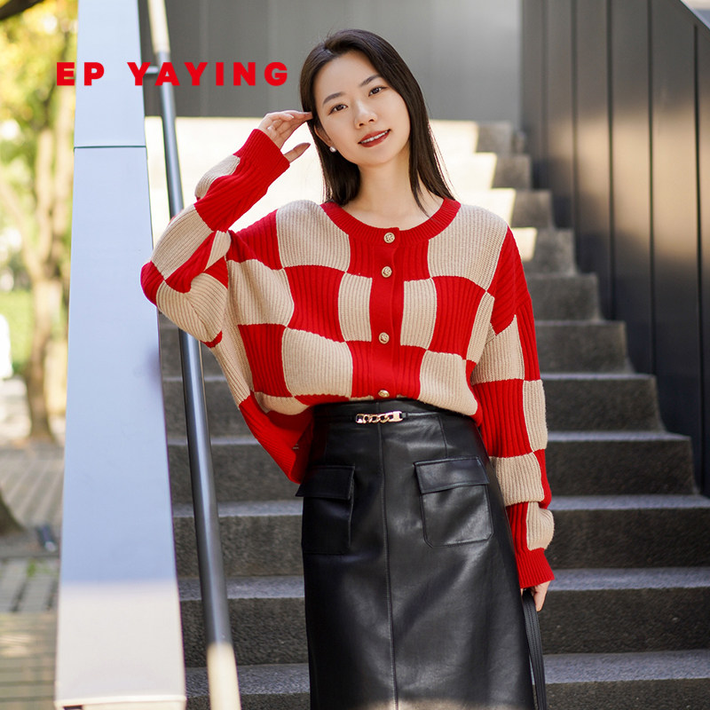 [龙年限定毛衣]EP雅莹2024新品 新年红羊毛羊绒棋盘格针织衫9505A