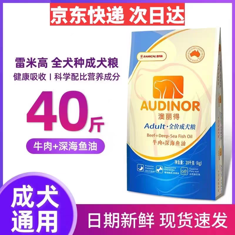 狗粮40斤雷米高澳丽得牛肉深海鱼油成犬粮泰迪金毛狗粮20kg通用型