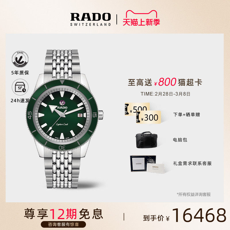 Rado瑞士雷达表库克船长系列绿库克机械腕表精钢手表男
