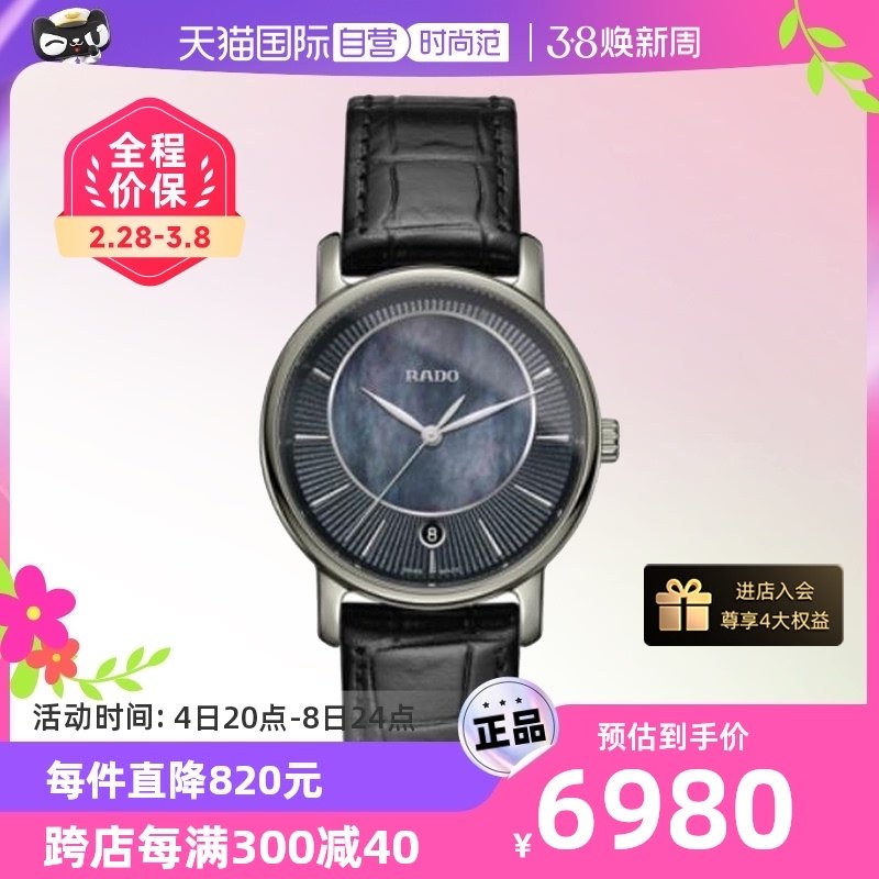 Rado瑞士雷达表钻霸系列母贝盘皮表带镶钻石英手表女