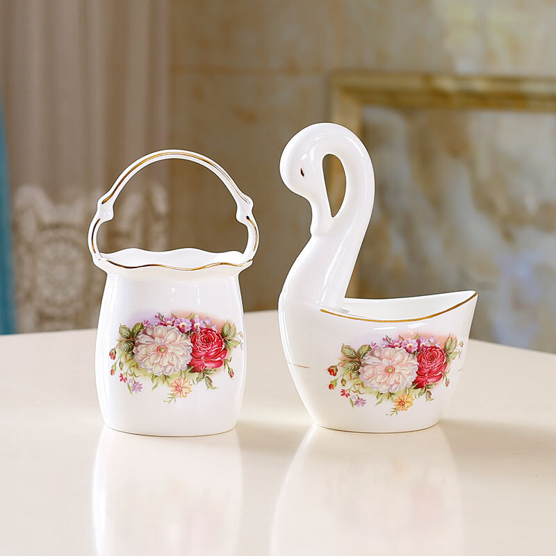 唐山骨瓷花篮天鹅装小调羹大汤勺汤匙精致陶瓷收纳筒创意摆件餐具