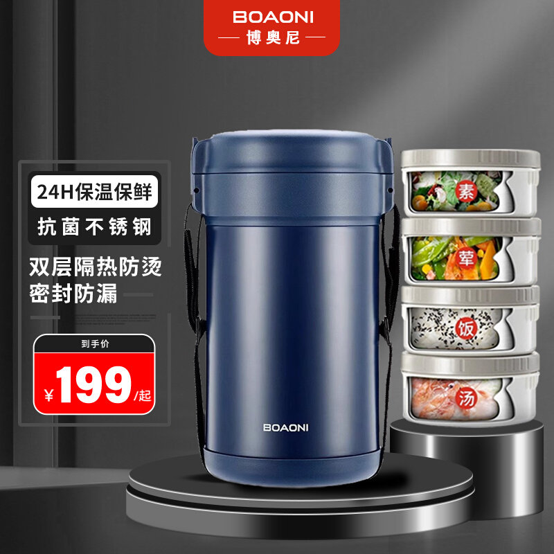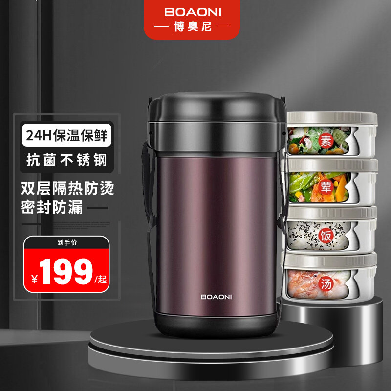 BOAONI316不锈钢保温饭盒超长保温桶大容量上班族三多层便携带饭