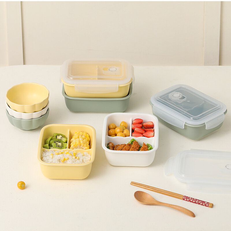 奶油黄密封保鲜盒分格收纳盒学生饭盒微波炉加热便当带饭陶瓷餐具