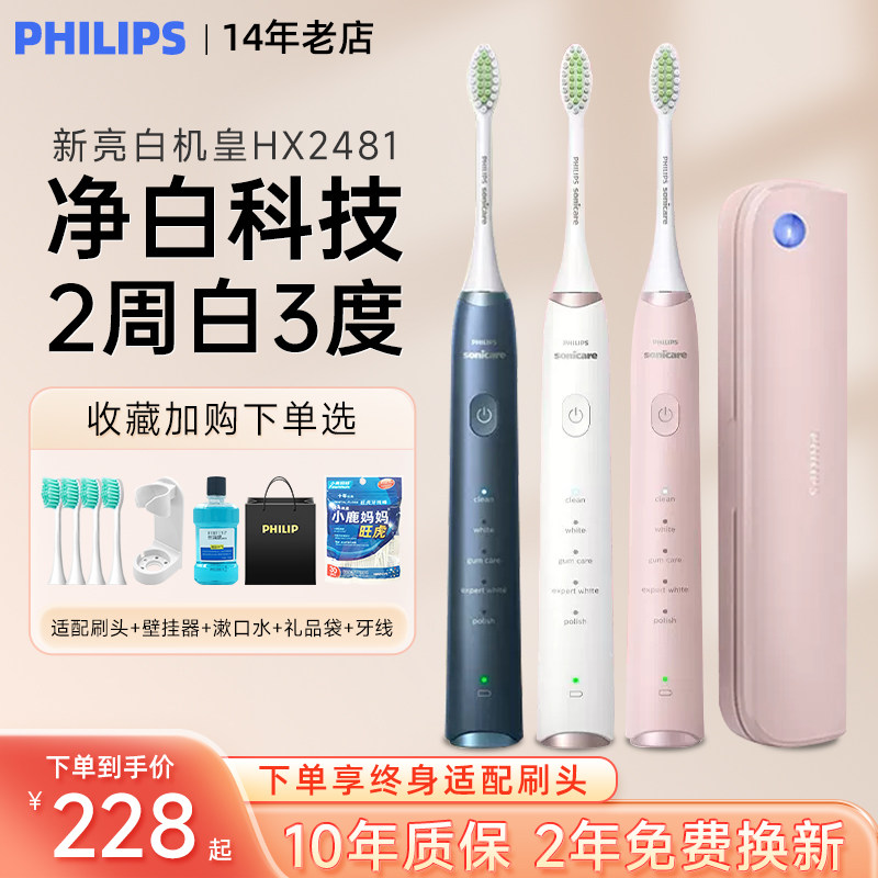 飞利浦电动牙刷HX2481杀菌款声波软毛充电式全自动成人男女情侣款