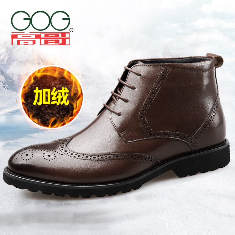 高哥内增高鞋男冬季加绒皮鞋男士真皮靴子高帮保暖棉鞋布洛克男鞋