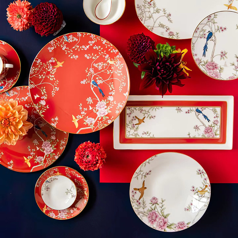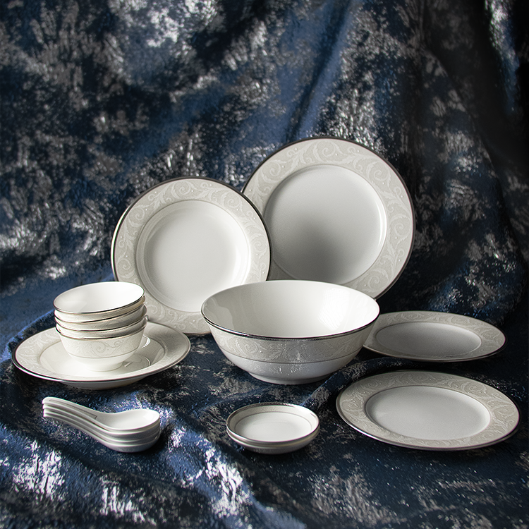 定制欧式鸣海浮雕图骨瓷摆台陶瓷餐具盘子咖啡杯刀叉勺餐巾圈10件