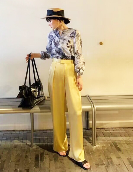 现货时髦芥末黄重磅缎面全真丝28姆米内衬14姆米真丝休闲直筒长裤