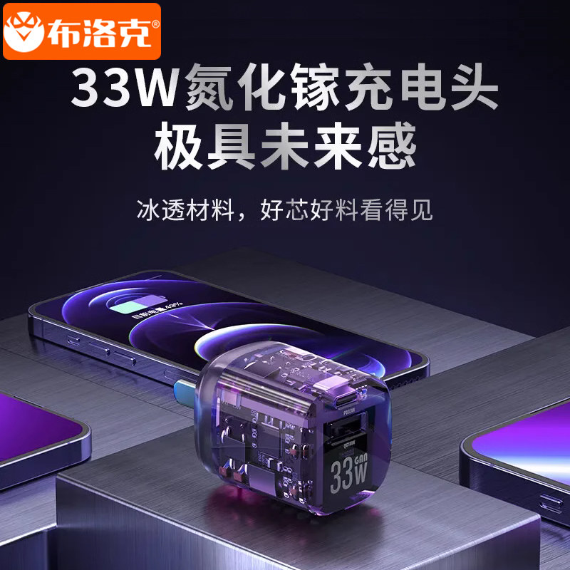 布洛克氮化镓透明充电器头33W超级快充PD20W插头双口max小巧便携式mini低温不伤机适用Type-C手机苹果15快充