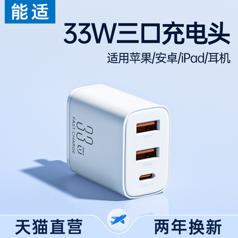 能适33w三口充电头typec多口20w双口款pd快充usb适用华为苹果手机充电器插头5v2a通用闪充14pro数据线13安卓
