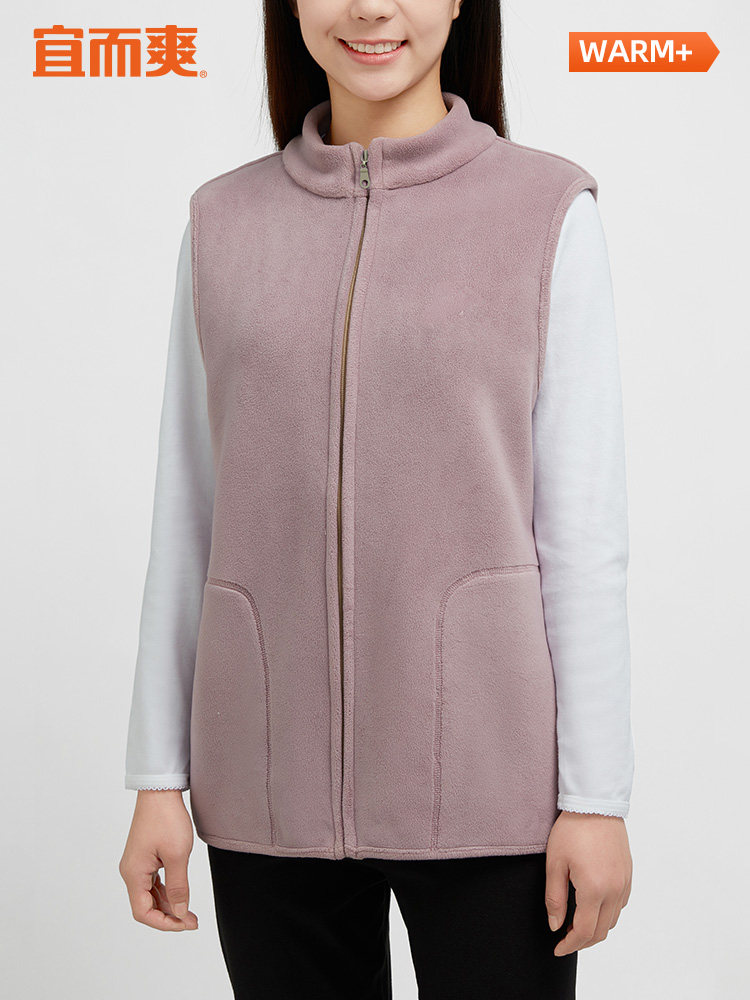 宜而爽新款女士羊羔毛内里加绒拉链保暖背心羊羔绒半立领高领马甲