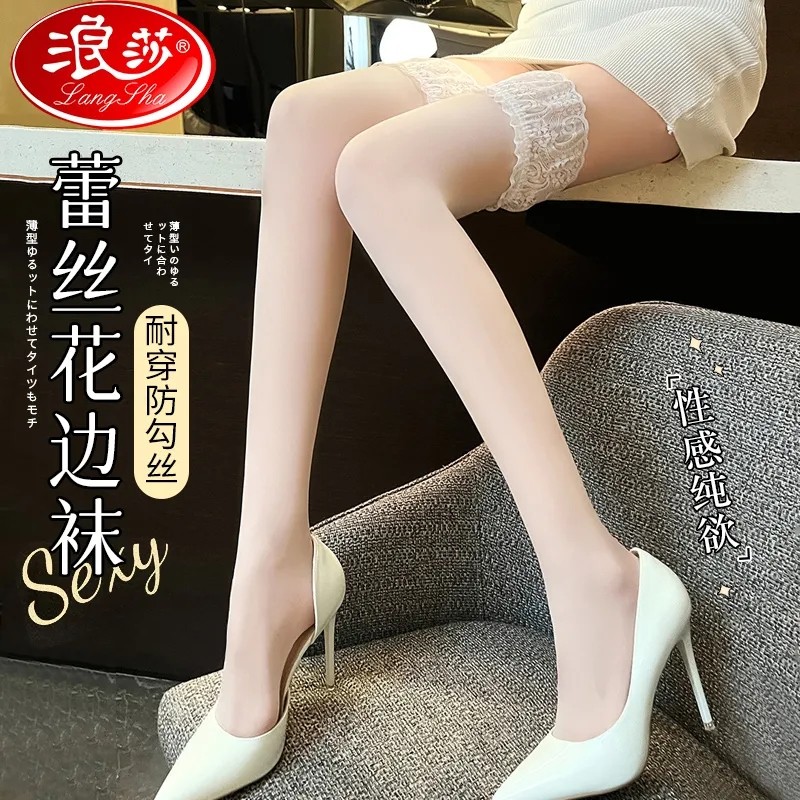 浪莎白丝袜性感蕾丝边夏季薄款大腿丝袜防勾丝黑丝袜子女高筒过膝