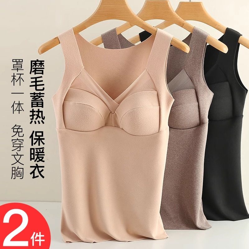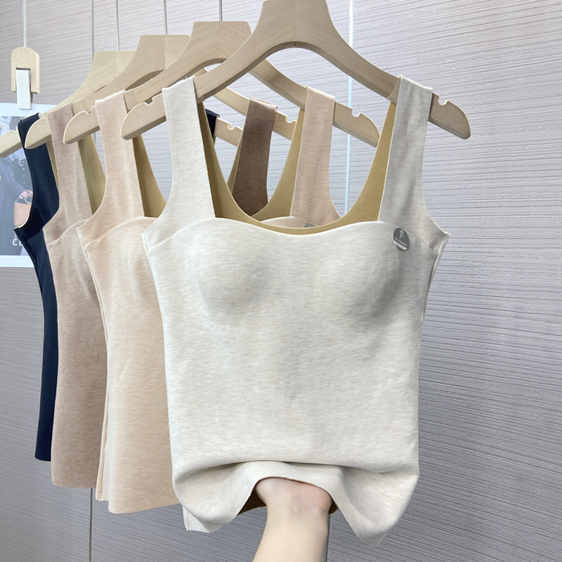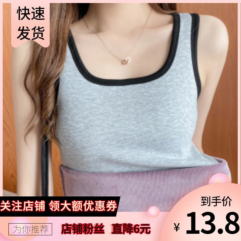 无痕带胸垫加绒吊带背心女秋冬内穿一体杯双面磨毛保暖打底上衣