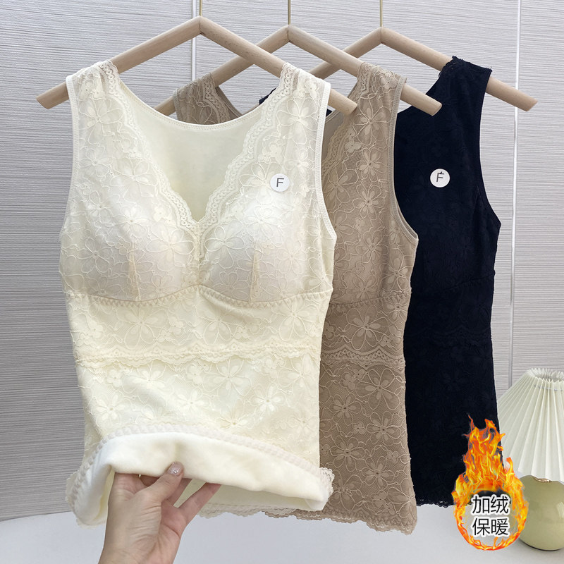 蕾丝保暖背心女带胸垫免穿文胸一体内搭打底加厚加绒吊带内衣冬季