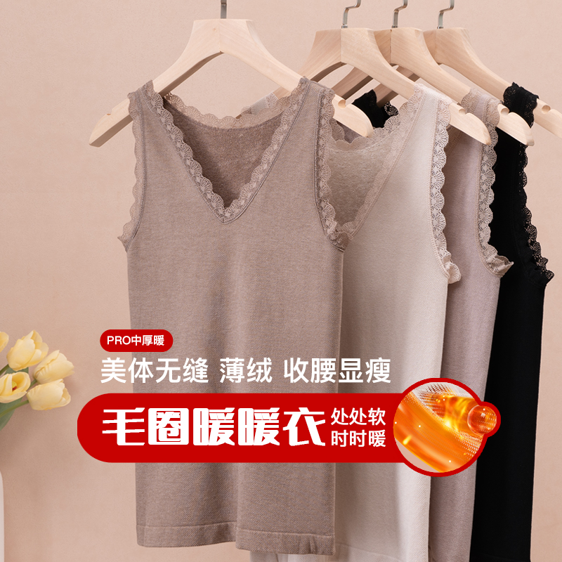秋冬德绒带胸垫一体保暖内衣女加绒加厚自发热V领吊带背心打底衫