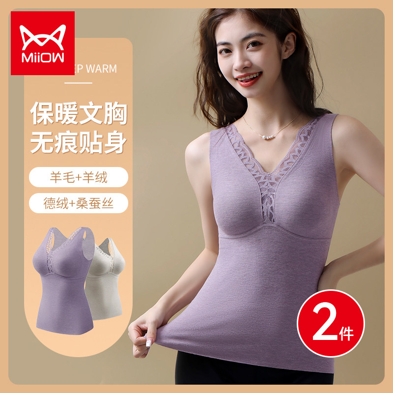 猫人保暖背心女德绒带胸垫免穿文胸秋冬羊绒蚕丝发热打底吊带内衣