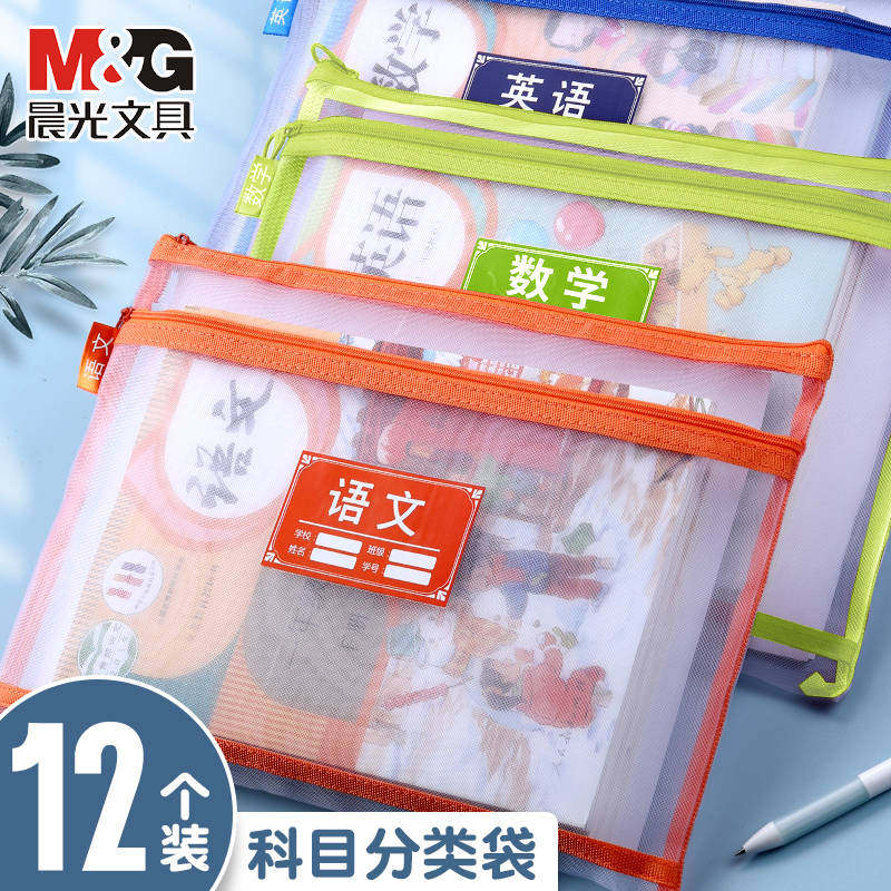 晨光文具学科科目分类文件袋透明拉链式小学生专用加厚双层网纱资料课本书本收纳袋子语文数学作业分科书袋a4