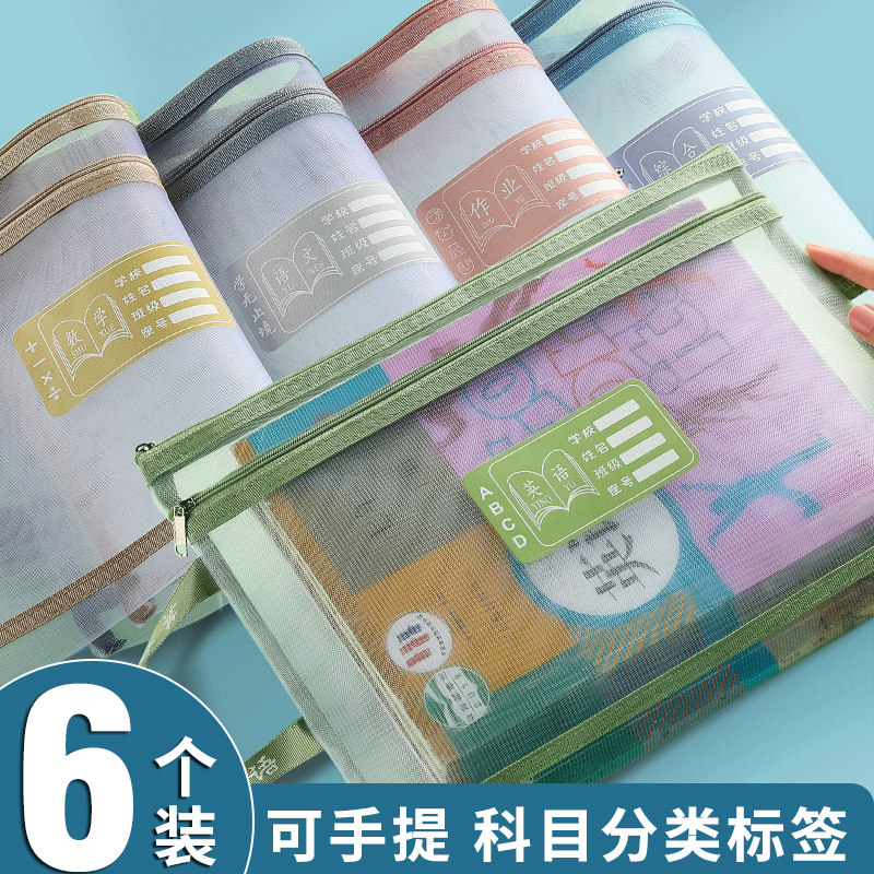 知远学科科目分类文件袋拉链双层大容量小学生用作业袋透明网纱a4资料袋语文数学分科书袋手提学生试卷收纳袋