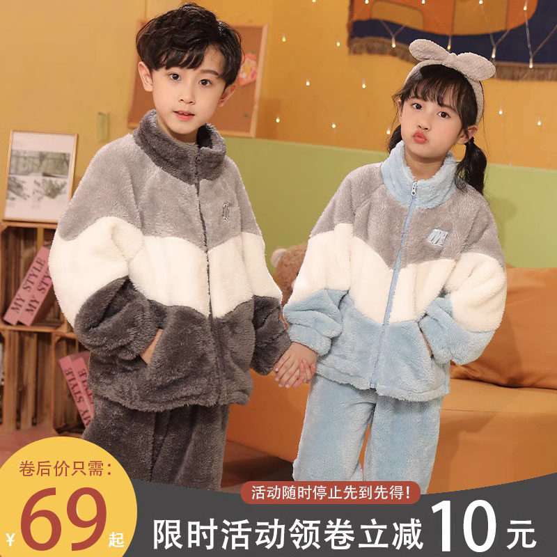 儿童睡衣套装加厚珊瑚绒秋冬季男童女童法兰绒中大童拉链家居服