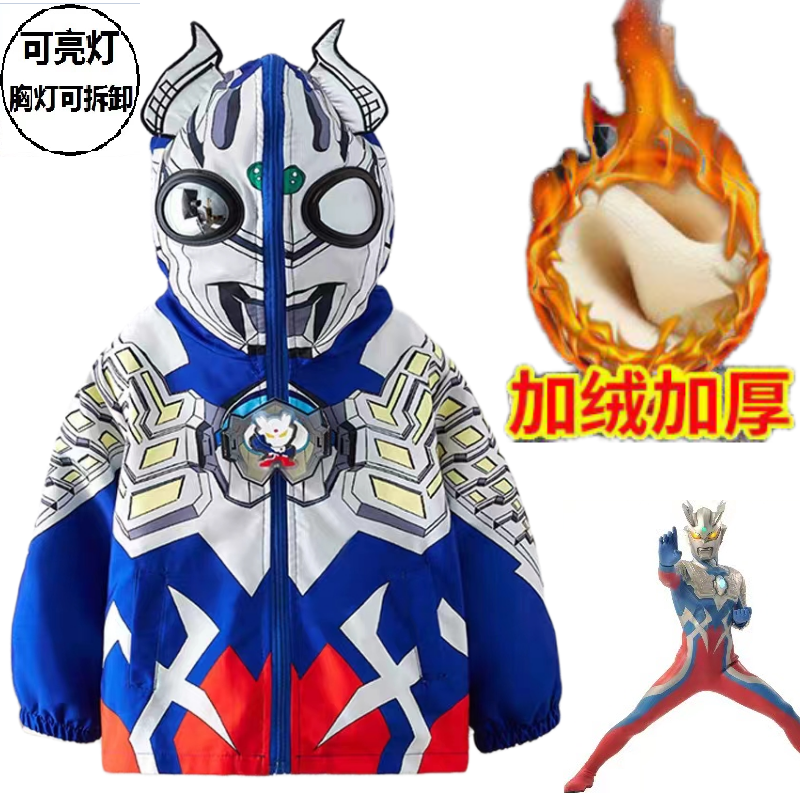 赛罗奥特曼男童风衣2023加绒带灯外套帅气连帽网红冲锋衣男孩棉衣