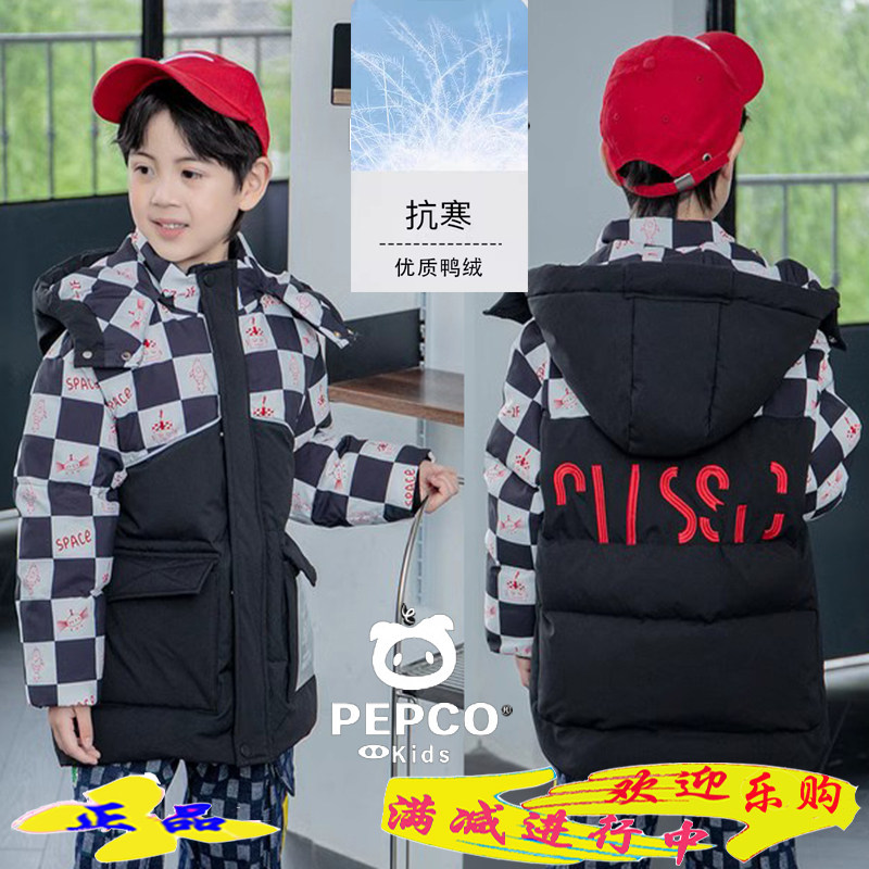 小猪班纳男童装小童时尚拼色羽绒服连帽厚保暖外套2023冬新潮风衣