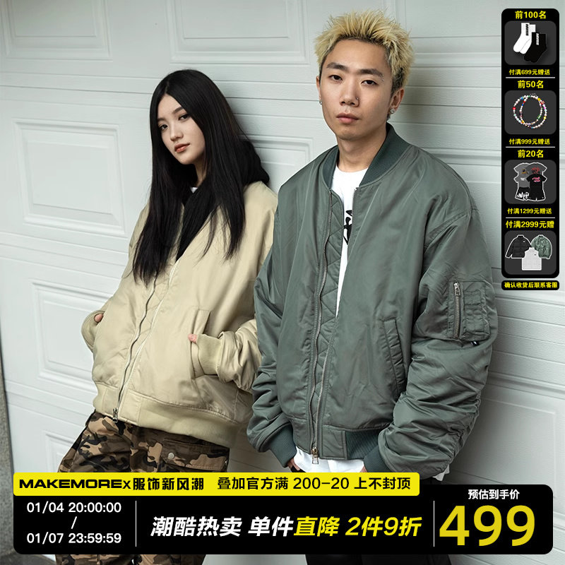 A carton刺绣高街MA-1飞行夹克冬季外套男宽松棉服美式棒球服棉衣