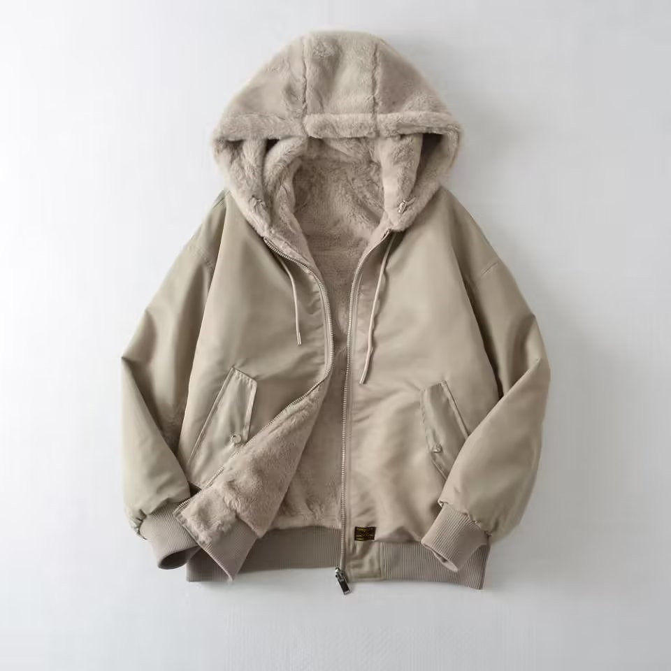 西班牙单~两面穿~加厚保暖宽松连帽麂皮绒毛毛加绒飞行员夹克外套
