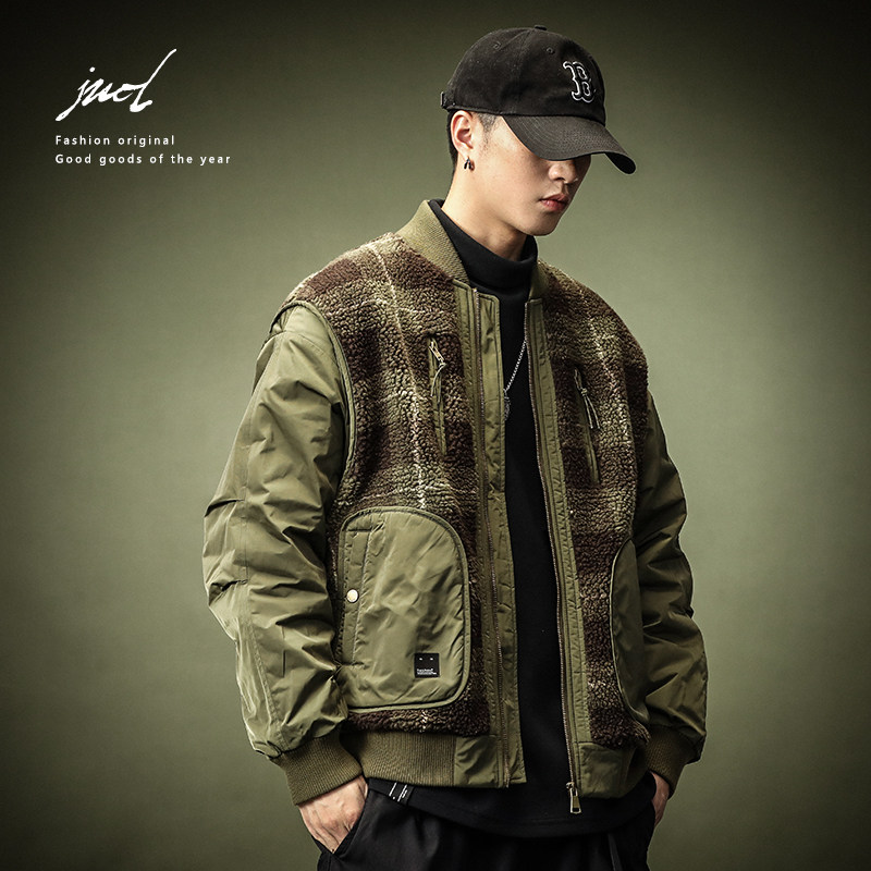 西班牙D~两面穿!男士加厚保暖宽松连帽飞行夹克棉服毛绒外套冬款