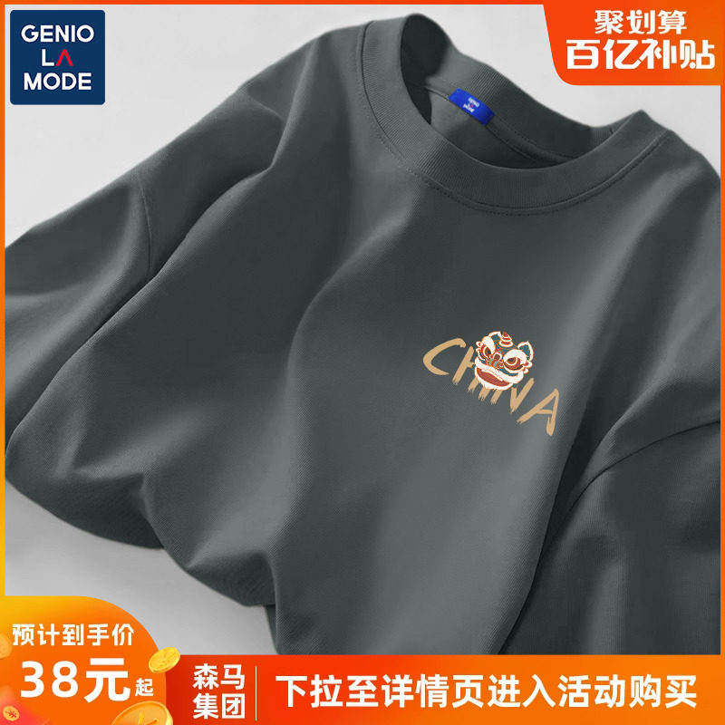 森马集团GENIOLAMODE灰色长袖t恤男款国潮醒狮秋季男士打底杉上衣