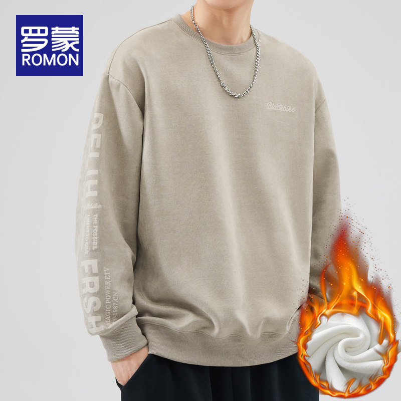 罗蒙秋冬季加绒卫衣男士2023新款圆领宽松长袖T恤加厚款休闲上衣