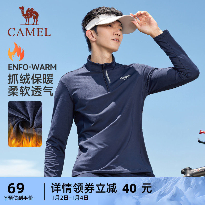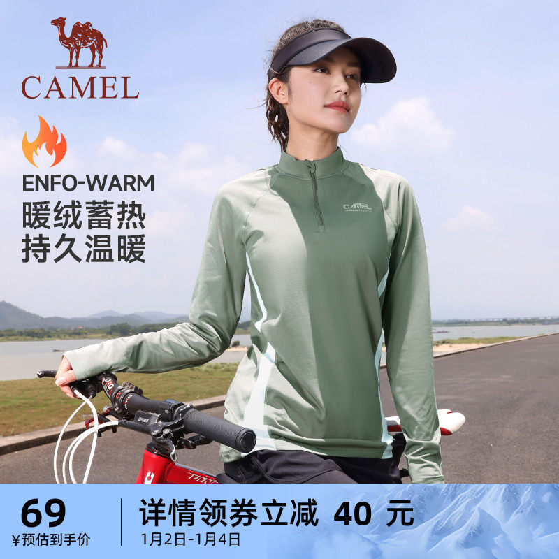 骆驼运动T恤男2023秋季新款加绒保暖长袖速干立领薄款跑步上衣女
