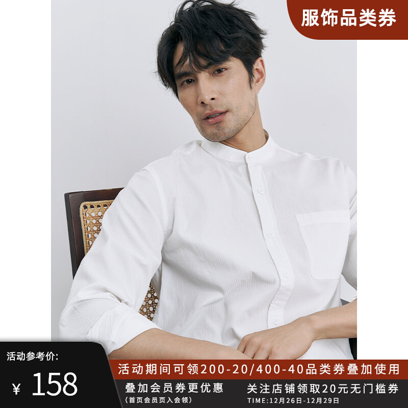 秋季设计感男士圆领纯棉休闲衬衫男商务高级感长袖立领白色衬衣潮