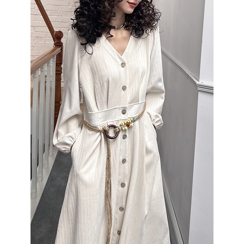 化学少女「自由国度」复古秋冬V领白色长裙经典法式衬衫连衣裙