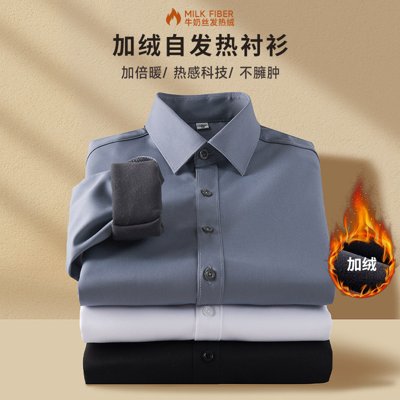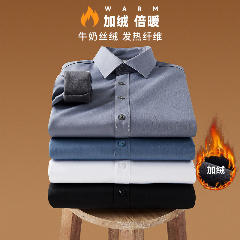 罗蒙加绒加厚保暖衬衫男士秋冬款弹力免烫纯色商务正装长袖白衬衣